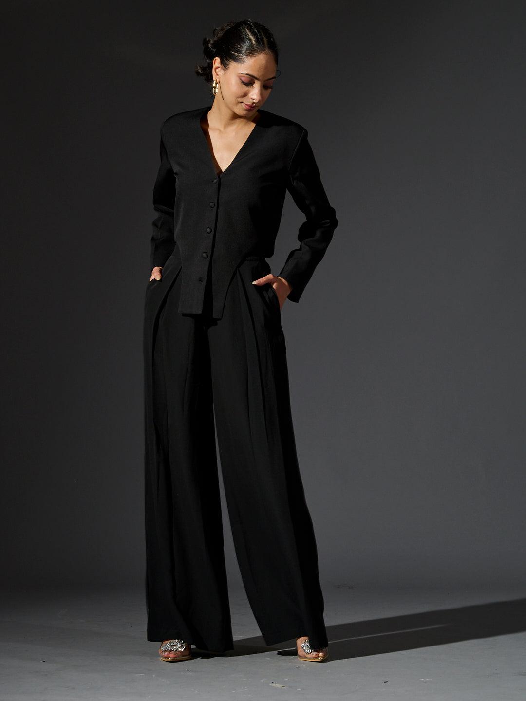 The accompanying flared pants complete the look, offering a modern twist that flatters any body type. The high-waisted design not only elongates the legs but also provides maximum comfort. This set is versatile, allowing you to mix and match with various tops and accessories.