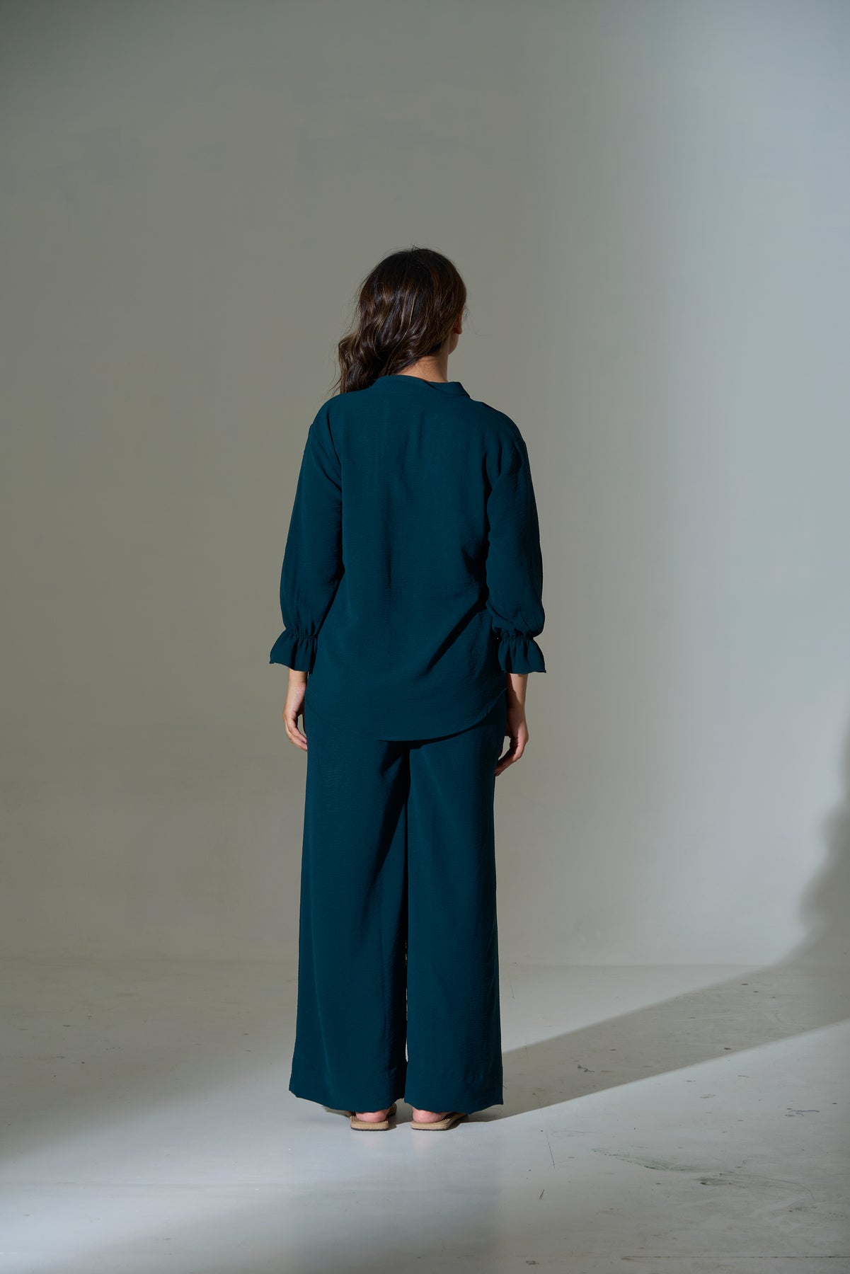 Fashioned from high-quality crepe fabric, this set is lightweight and breathable, allowing for all-day wear. The top features a relaxed silhouette, complete with a subtle V-neckline. Its long sleeves provide an inviting look, while the coordinated pants showcase a flowing, wide-leg design that drapes beautifully.