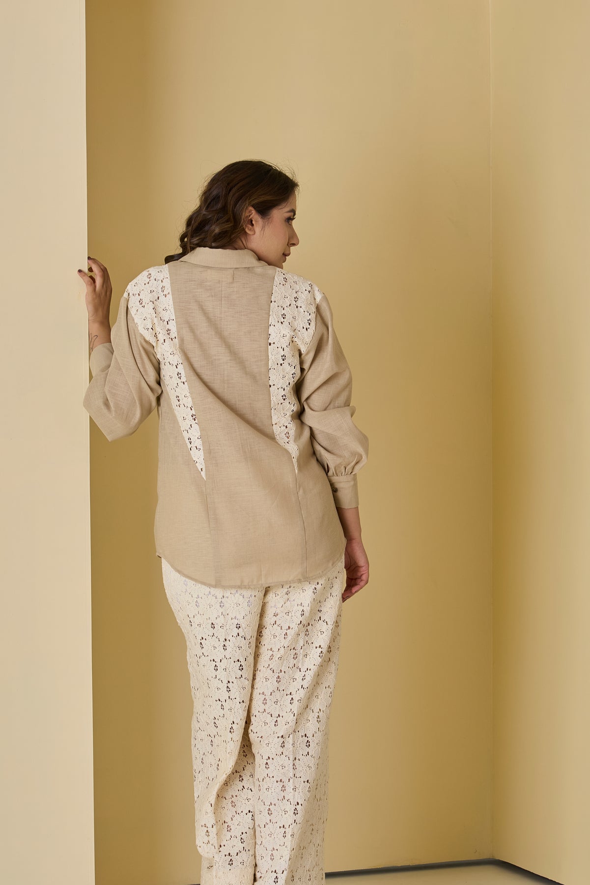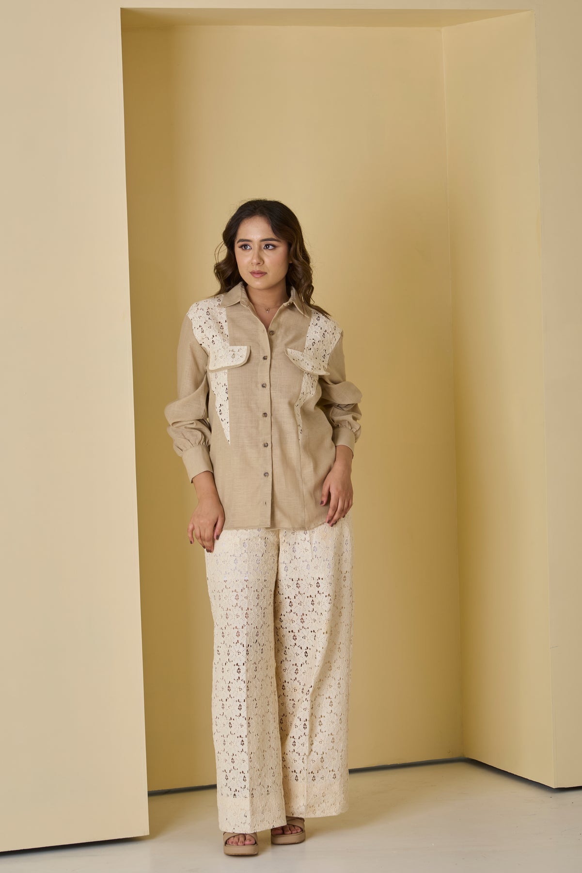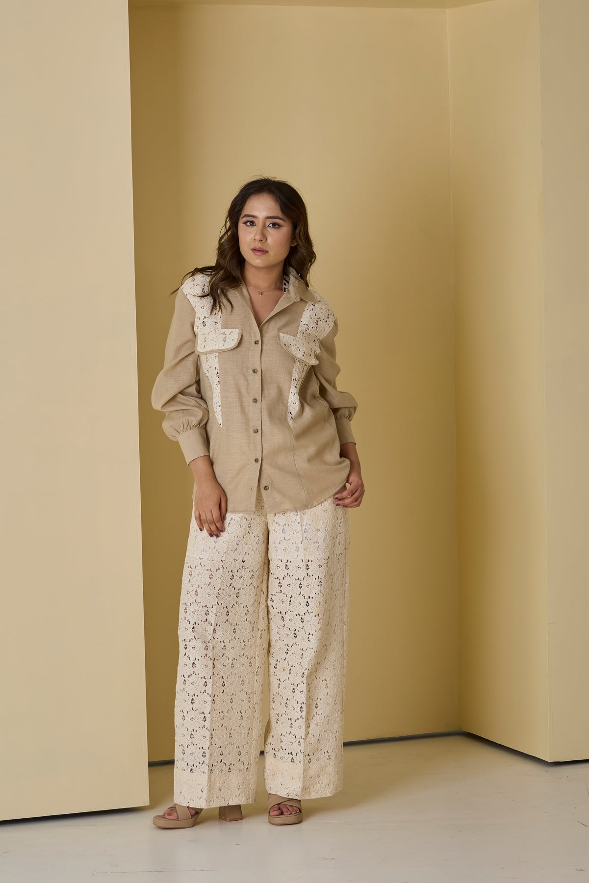 The top showcases a stylish button-up design, easy to wear and versatile enough for both casual and dressy settings. The relaxed fit ensures all-day comfort, while the unique crochet elements provide a fashionable flair. Paired with the matching pants, this crochet co-ord set for women creates a cohesive look that stands out wherever you go.