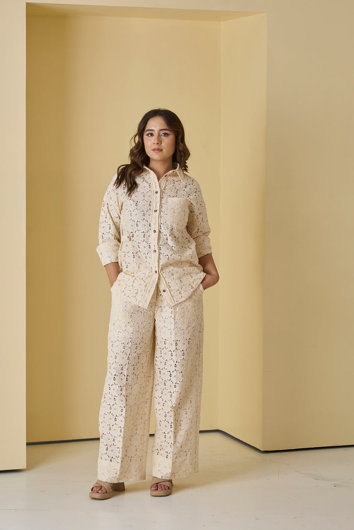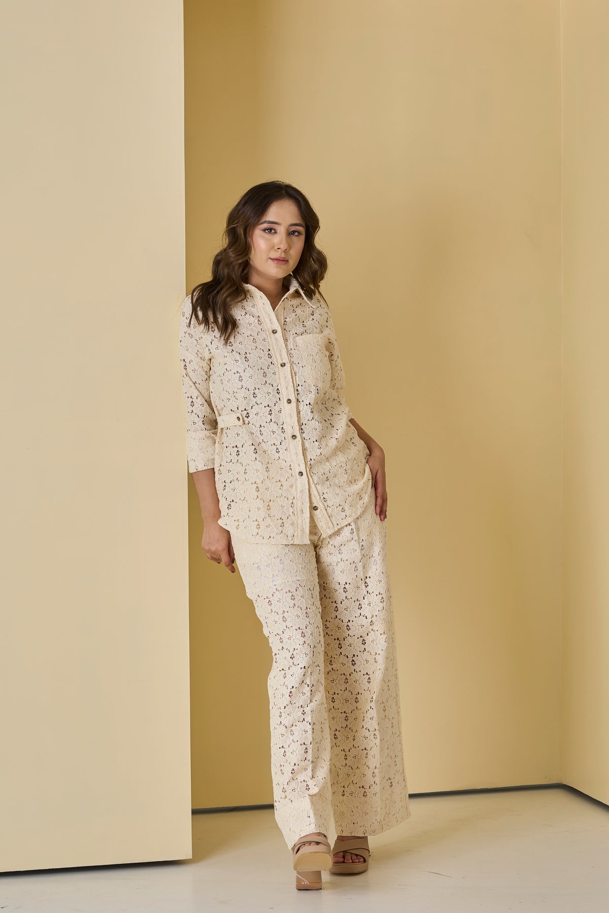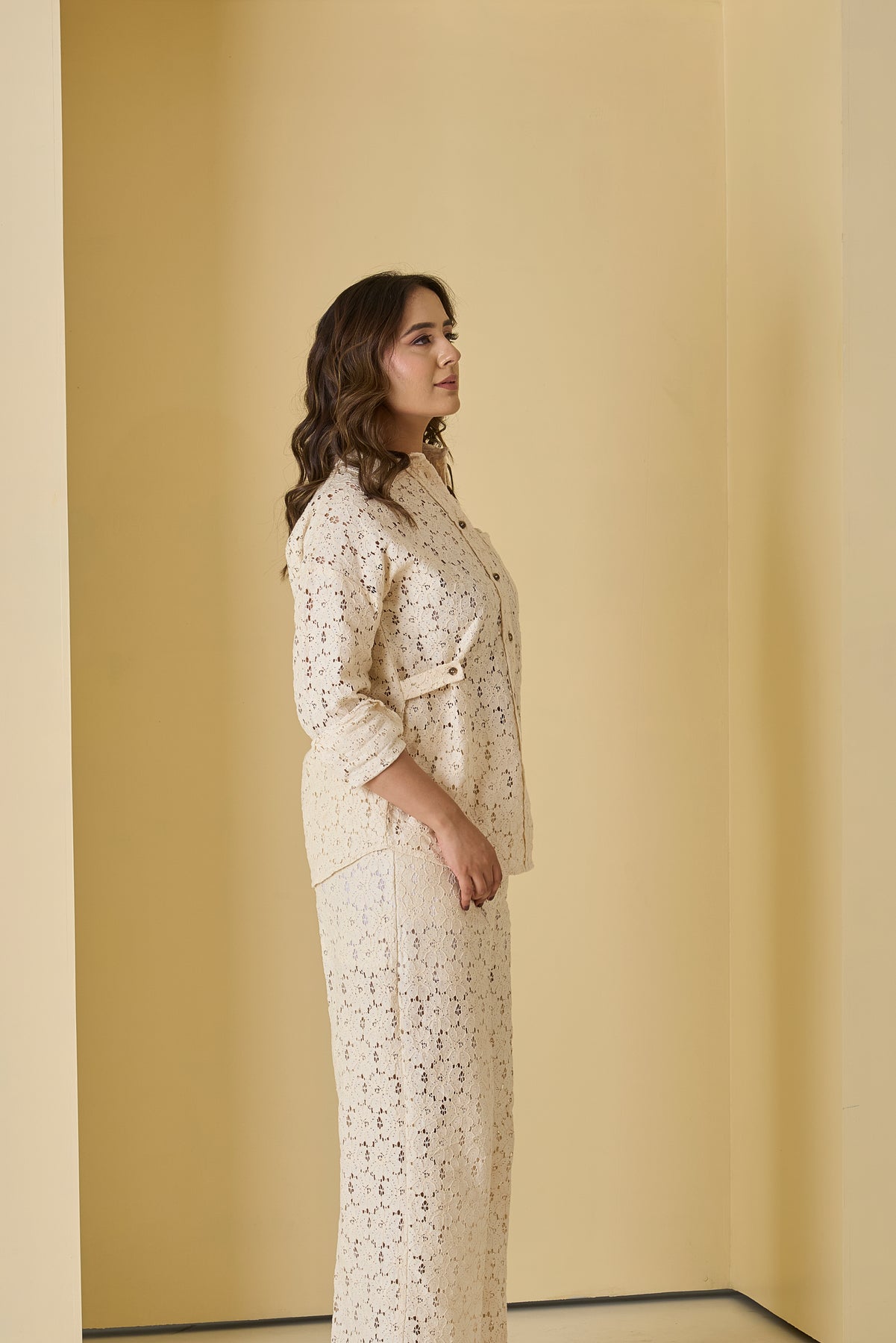 This lace co-ord set for women is a versatile addition that can be styled in many ways. Pair it with heels for an upscale look or dress it down with sneakers for a casual vibe. The neutral tone allows for easy mixing and matching, so you can make it your own.