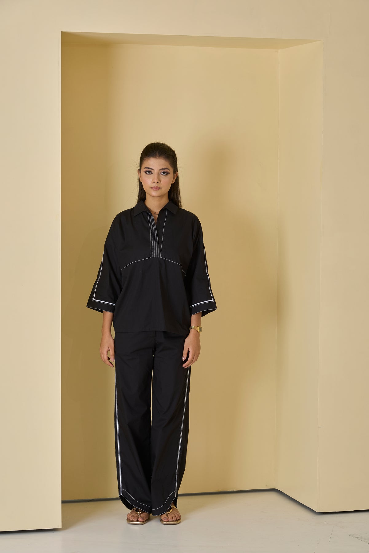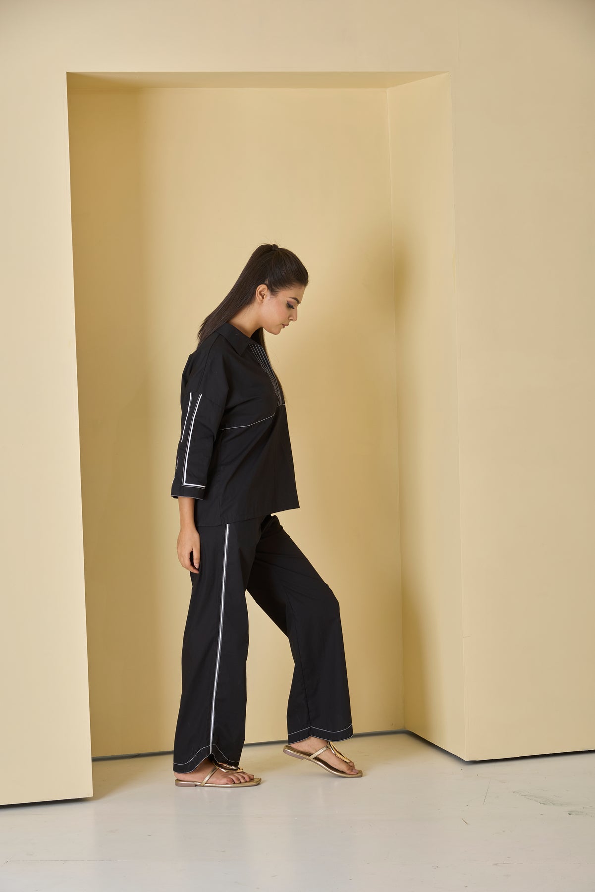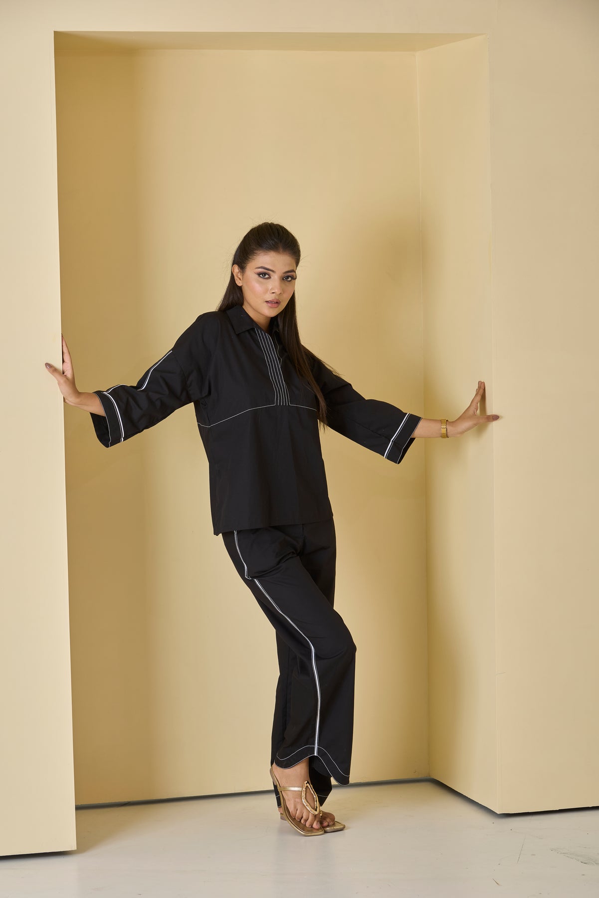 Introducing the women's black piped western set, a stunning addition to your wardrobe. This co-ord set from Risate brings you both style and comfort in one sleek package. Made with premium materials, the set features a beautifully designed top that pairs perfectly with flattering wide-leg pants.
