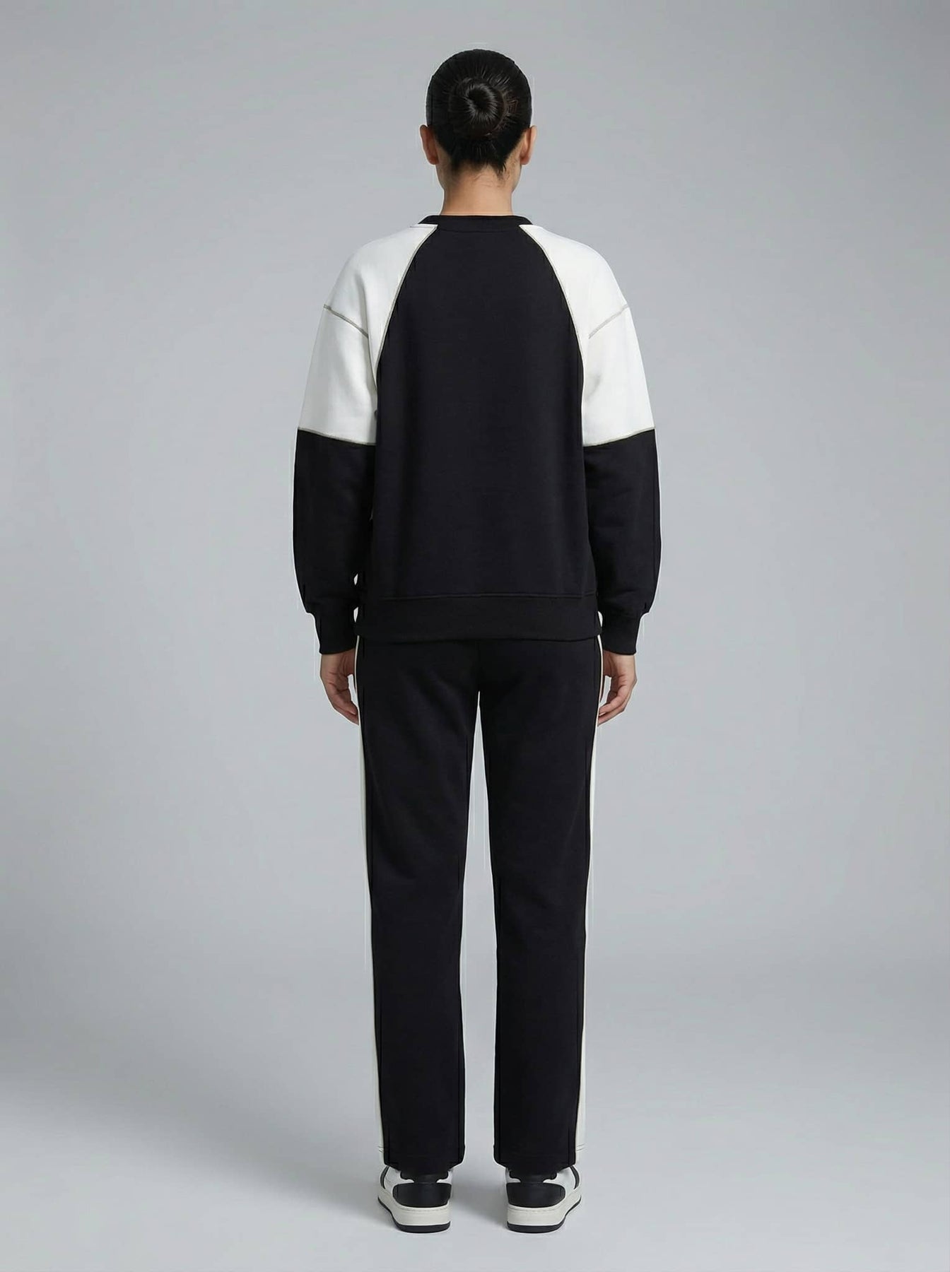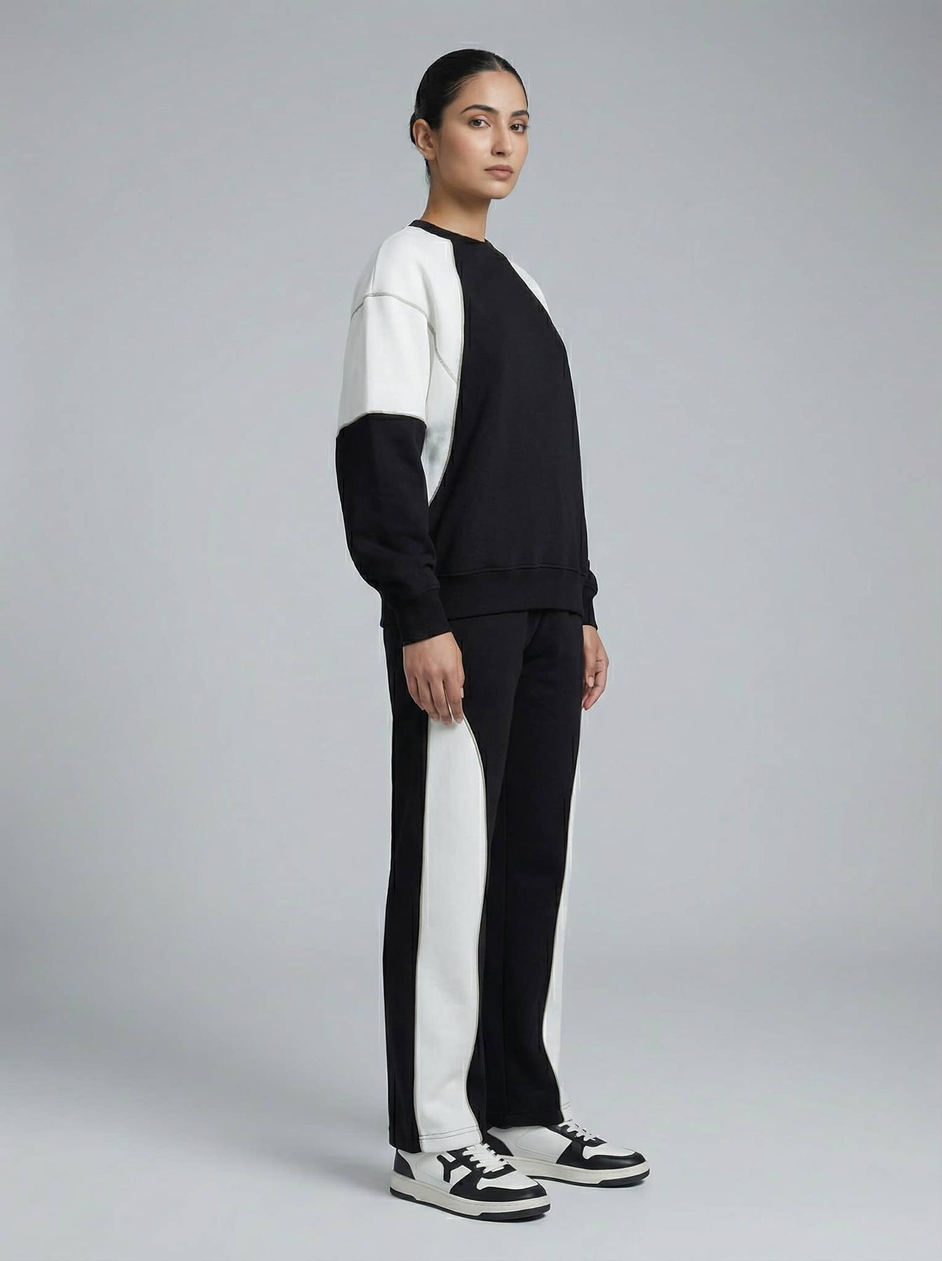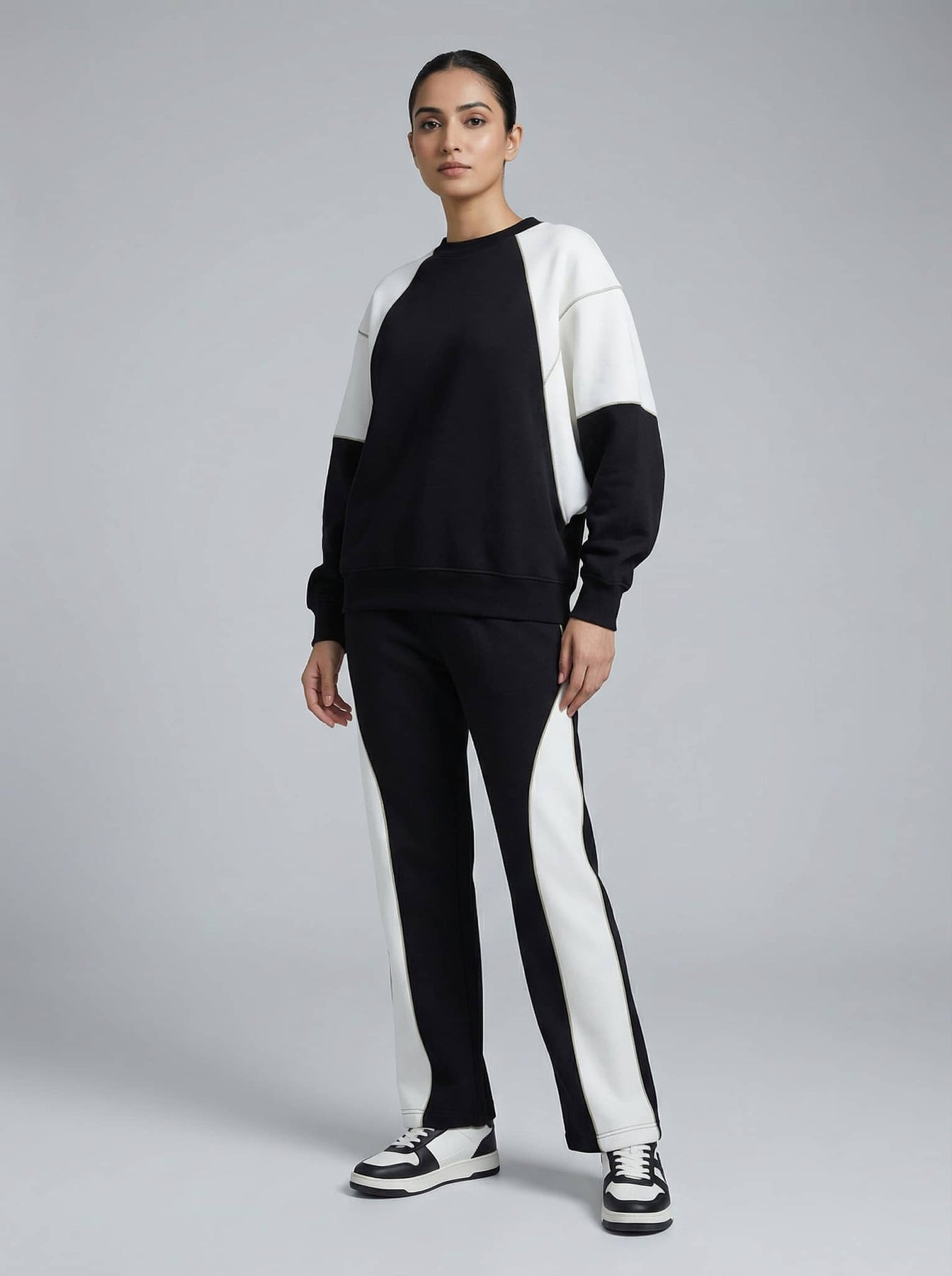 Crafted from high-quality materials, the Eclipse Block Co-ord Set ensures durability and comfort. It consists of a cozy sweatshirt with a relaxed fit and matching pants that provide an easygoing silhouette. Ideal for layering, this women's co-ord set maintains a trendy edge while being easy to wear anywhere.