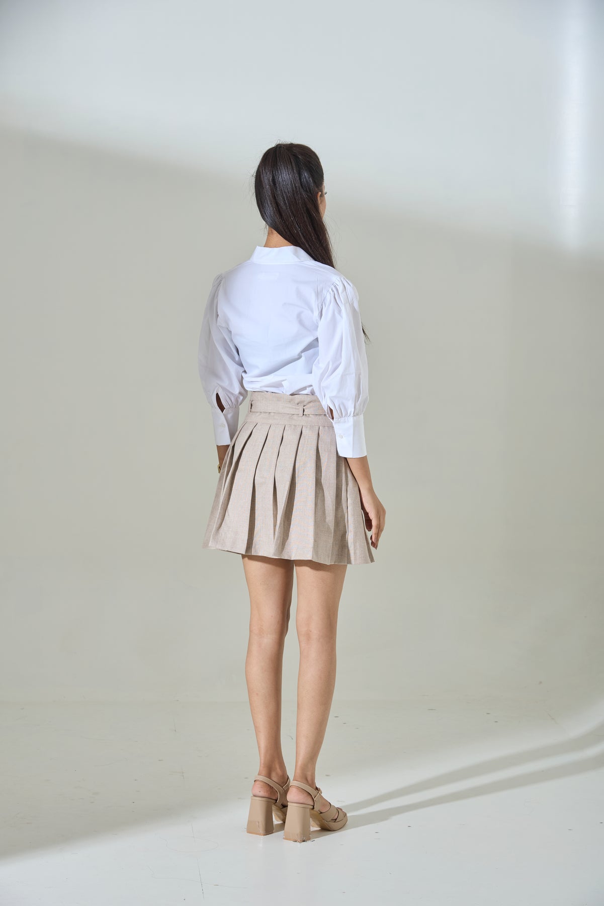 Back view of a woman wearing the Nina pleated mini skirt paired with a white button-up blouse