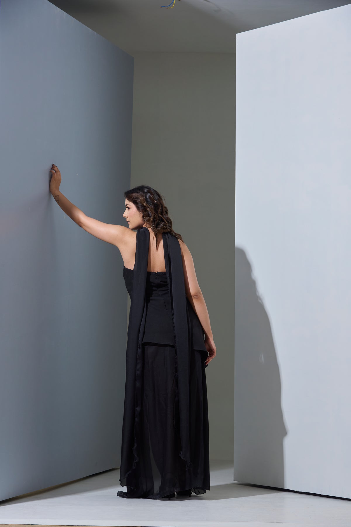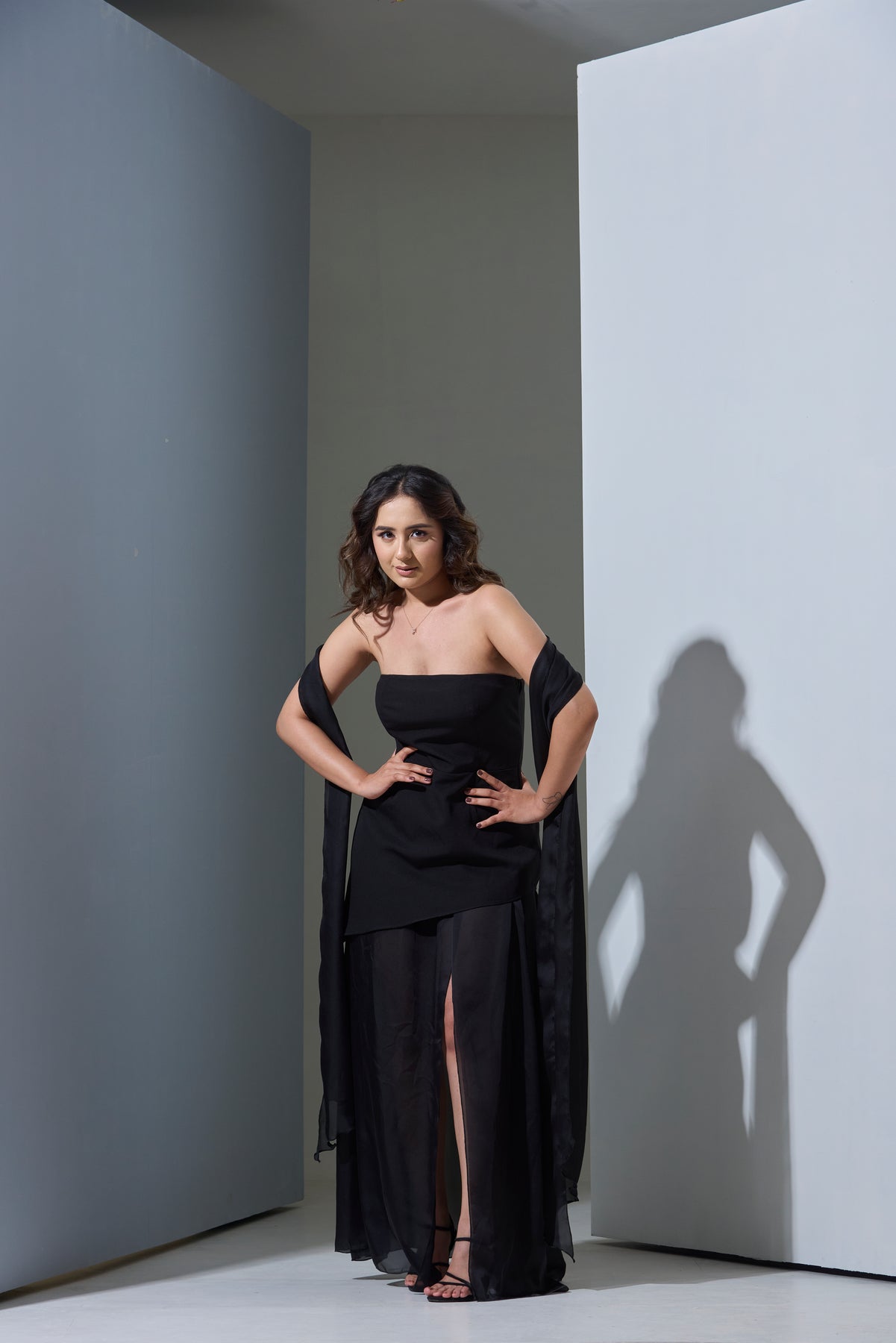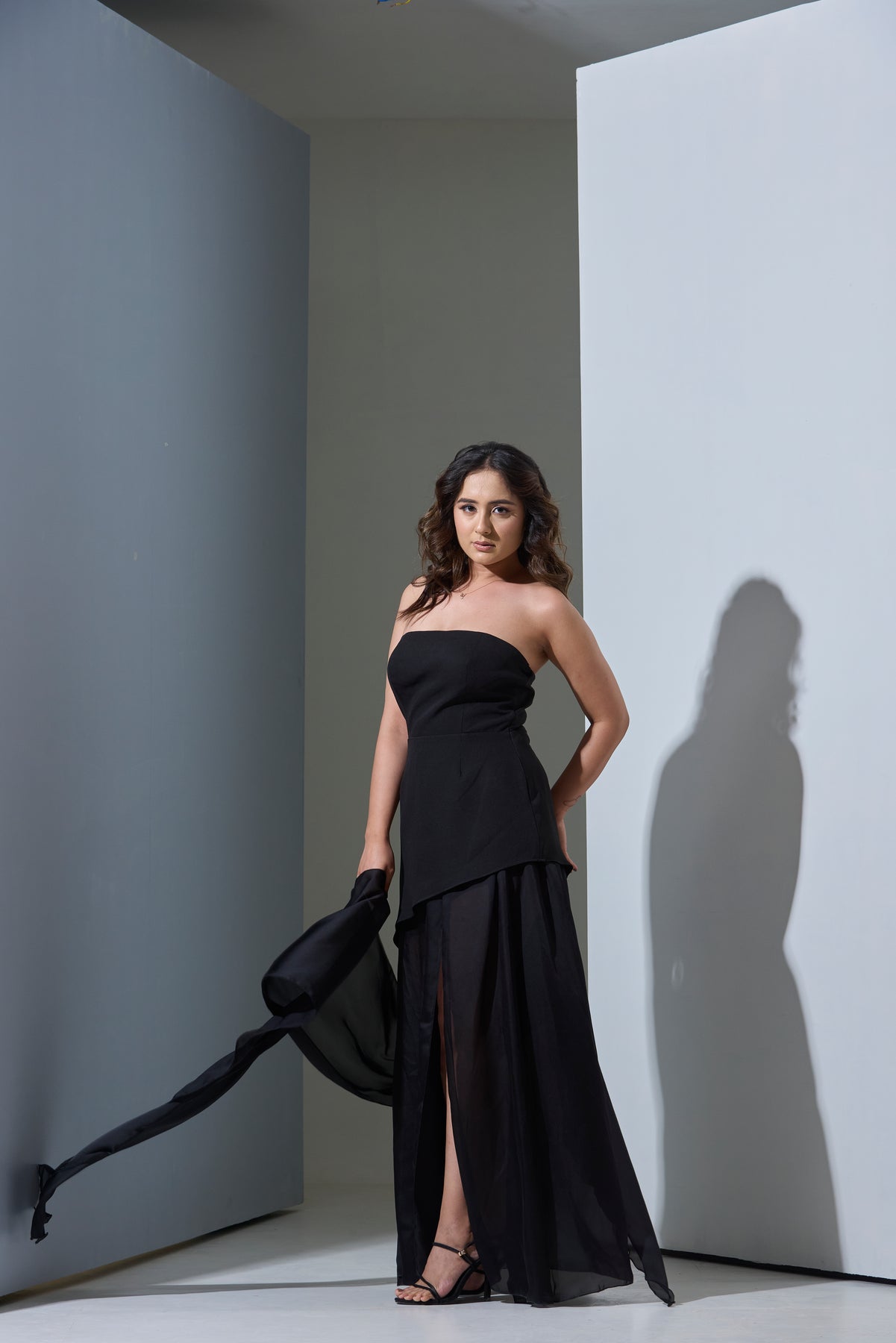 The black strapless evening dress from Risate is the epitome of elegance and modern style. Crafted with premium materials, this dress promises both comfort and sophistication. Its strapless design highlights your shoulders, making it perfect for special occasions.