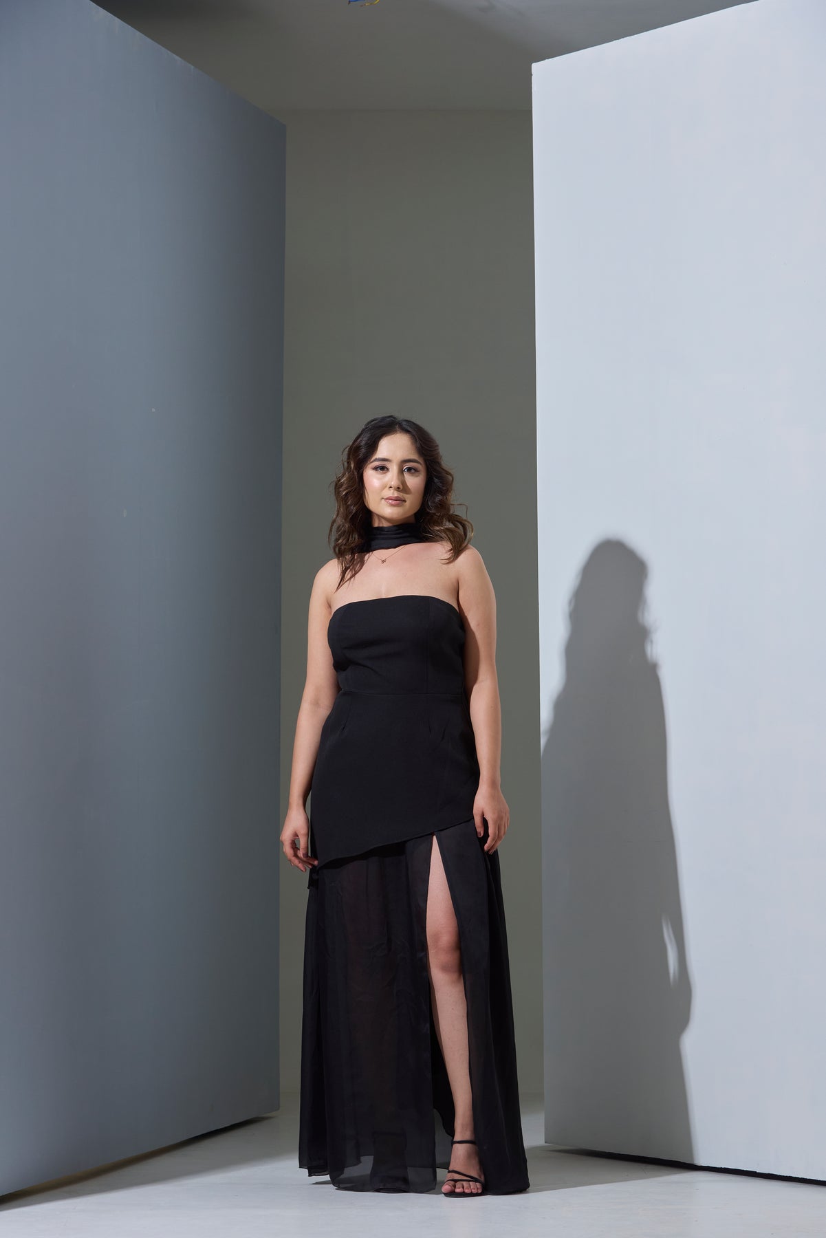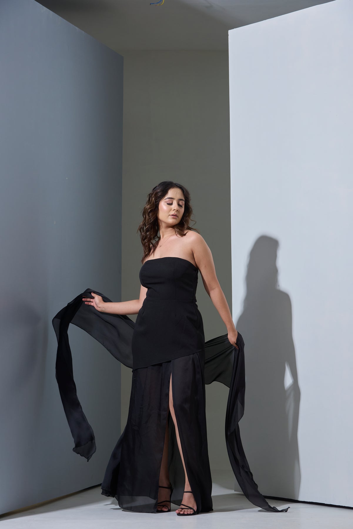 With a flattering silhouette, this black strapless evening dress features a chic asymmetrical hem. The high slit on the side adds a touch of daring flair, allowing you to showcase your favorite heels. Ideal for evening soirées or formal dinners, this dress is as versatile as it is stunning.