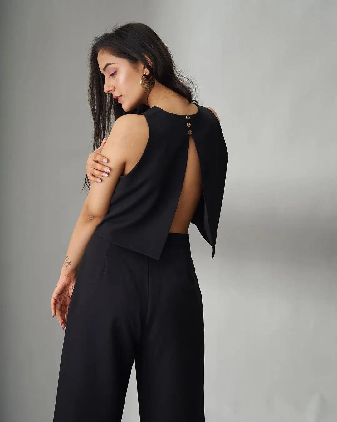 Elegant black co-ord set for women featuring a stylish back design with button details
