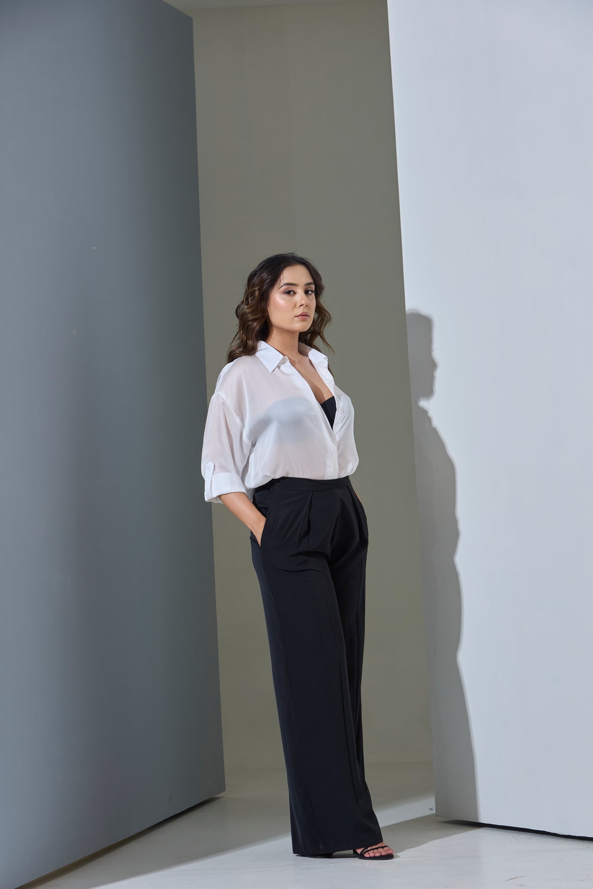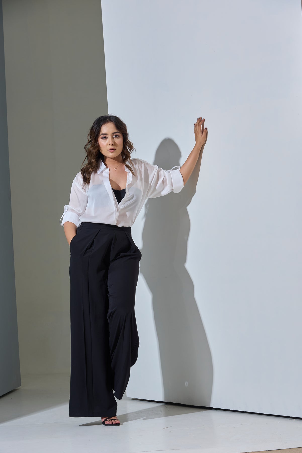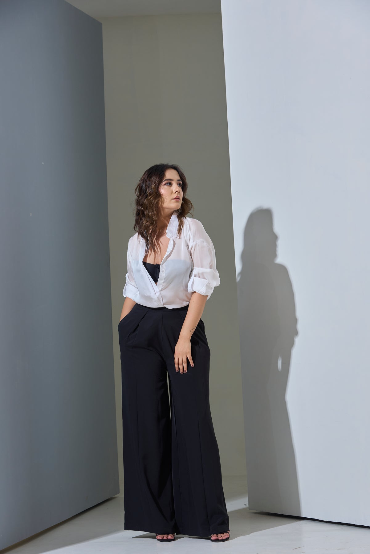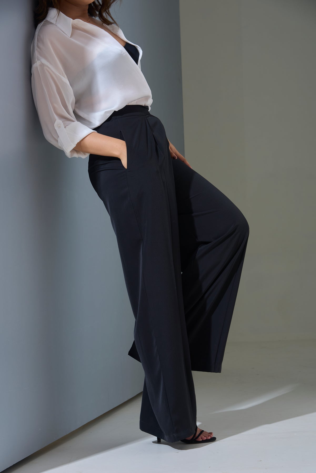 Make a statement with the elegant drape of our designer black wide leg pants for women. Ideal for layering, they work beautifully with oversized jackets or fitted blazers. Whether you're heading to a brunch with friends or a night out, these pants will elevate your outfit effortlessly.